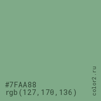 Цвет #7FAA88 в цветовой модели RGB обозначается тремя октетами (127, 170, 136) в десятичном формате и #7FAA88 в шестнадцатиричном (hex) формате, которые являются интенсивностью красного 127 (hex 7F), интенсивность зелёного 170 (hex AA) и интенсивность синего 136 (hex 88).