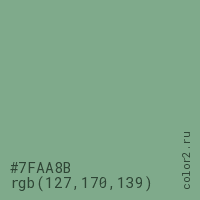Цвет #7FAA8B в цветовой модели RGB обозначается тремя октетами (127, 170, 139) в десятичном формате и #7FAA8B в шестнадцатиричном (hex) формате, которые являются интенсивностью красного 127 (hex 7F), интенсивность зелёного 170 (hex AA) и интенсивность синего 139 (hex 8B).