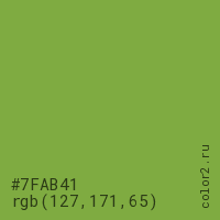 Цвет #7FAB41 в цветовой модели RGB обозначается тремя октетами (127, 171, 65) в десятичном формате и #7FAB41 в шестнадцатиричном (hex) формате, которые являются интенсивностью красного 127 (hex 7F), интенсивность зелёного 171 (hex AB) и интенсивность синего 65 (hex 41).