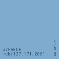 Цвет #7FABCE в цветовой модели RGB обозначается тремя октетами (127, 171, 206) в десятичном формате и #7FABCE в шестнадцатиричном (hex) формате, которые являются интенсивностью красного 127 (hex 7F), интенсивность зелёного 171 (hex AB) и интенсивность синего 206 (hex CE).