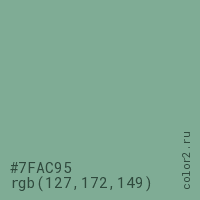Цвет #7FAC95 в цветовой модели RGB обозначается тремя октетами (127, 172, 149) в десятичном формате и #7FAC95 в шестнадцатиричном (hex) формате, которые являются интенсивностью красного 127 (hex 7F), интенсивность зелёного 172 (hex AC) и интенсивность синего 149 (hex 95).