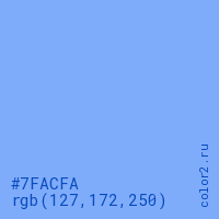 Цвет #7FACFA в цветовой модели RGB обозначается тремя октетами (127, 172, 250) в десятичном формате и #7FACFA в шестнадцатиричном (hex) формате, которые являются интенсивностью красного 127 (hex 7F), интенсивность зелёного 172 (hex AC) и интенсивность синего 250 (hex FA).