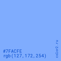 Цвет #7FACFE в цветовой модели RGB обозначается тремя октетами (127, 172, 254) в десятичном формате и #7FACFE в шестнадцатиричном (hex) формате, которые являются интенсивностью красного 127 (hex 7F), интенсивность зелёного 172 (hex AC) и интенсивность синего 254 (hex FE).