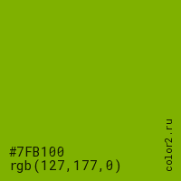 Цвет #7FB100 в цветовой модели RGB обозначается тремя октетами (127, 177, 0) в десятичном формате и #7FB100 в шестнадцатиричном (hex) формате, которые являются интенсивностью красного 127 (hex 7F), интенсивность зелёного 177 (hex B1) и интенсивность синего 0 (hex 00).