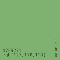 Цвет #7FB271 в цветовой модели RGB обозначается тремя октетами (127, 178, 113) в десятичном формате и #7FB271 в шестнадцатиричном (hex) формате, которые являются интенсивностью красного 127 (hex 7F), интенсивность зелёного 178 (hex B2) и интенсивность синего 113 (hex 71).