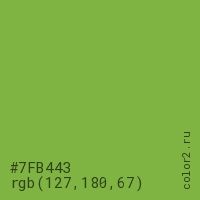 Цвет #7FB443 в цветовой модели RGB обозначается тремя октетами (127, 180, 67) в десятичном формате и #7FB443 в шестнадцатиричном (hex) формате, которые являются интенсивностью красного 127 (hex 7F), интенсивность зелёного 180 (hex B4) и интенсивность синего 67 (hex 43).