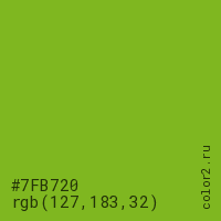 Цвет #7FB720 в цветовой модели RGB обозначается тремя октетами (127, 183, 32) в десятичном формате и #7FB720 в шестнадцатиричном (hex) формате, которые являются интенсивностью красного 127 (hex 7F), интенсивность зелёного 183 (hex B7) и интенсивность синего 32 (hex 20).