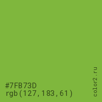 Цвет #7FB73D в цветовой модели RGB обозначается тремя октетами (127, 183, 61) в десятичном формате и #7FB73D в шестнадцатиричном (hex) формате, которые являются интенсивностью красного 127 (hex 7F), интенсивность зелёного 183 (hex B7) и интенсивность синего 61 (hex 3D).