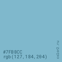 Цвет #7FB8CC в цветовой модели RGB обозначается тремя октетами (127, 184, 204) в десятичном формате и #7FB8CC в шестнадцатиричном (hex) формате, которые являются интенсивностью красного 127 (hex 7F), интенсивность зелёного 184 (hex B8) и интенсивность синего 204 (hex CC).