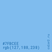 Цвет #7FBCEE в цветовой модели RGB обозначается тремя октетами (127, 188, 238) в десятичном формате и #7FBCEE в шестнадцатиричном (hex) формате, которые являются интенсивностью красного 127 (hex 7F), интенсивность зелёного 188 (hex BC) и интенсивность синего 238 (hex EE).