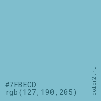 Цвет #7FBECD в цветовой модели RGB обозначается тремя октетами (127, 190, 205) в десятичном формате и #7FBECD в шестнадцатиричном (hex) формате, которые являются интенсивностью красного 127 (hex 7F), интенсивность зелёного 190 (hex BE) и интенсивность синего 205 (hex CD).