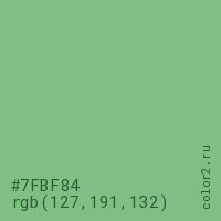 Цвет #7FBF84 в цветовой модели RGB обозначается тремя октетами (127, 191, 132) в десятичном формате и #7FBF84 в шестнадцатиричном (hex) формате, которые являются интенсивностью красного 127 (hex 7F), интенсивность зелёного 191 (hex BF) и интенсивность синего 132 (hex 84).