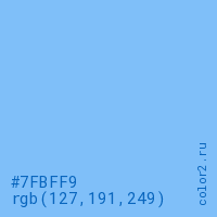 Цвет #7FBFF9 в цветовой модели RGB обозначается тремя октетами (127, 191, 249) в десятичном формате и #7FBFF9 в шестнадцатиричном (hex) формате, которые являются интенсивностью красного 127 (hex 7F), интенсивность зелёного 191 (hex BF) и интенсивность синего 249 (hex F9).