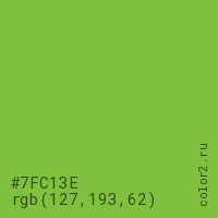 Цвет #7FC13E в цветовой модели RGB обозначается тремя октетами (127, 193, 62) в десятичном формате и #7FC13E в шестнадцатиричном (hex) формате, которые являются интенсивностью красного 127 (hex 7F), интенсивность зелёного 193 (hex C1) и интенсивность синего 62 (hex 3E).
