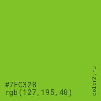 Цвет #7FC328 в цветовой модели RGB обозначается тремя октетами (127, 195, 40) в десятичном формате и #7FC328 в шестнадцатиричном (hex) формате, которые являются интенсивностью красного 127 (hex 7F), интенсивность зелёного 195 (hex C3) и интенсивность синего 40 (hex 28).