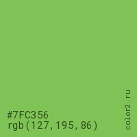 Цвет #7FC356 в цветовой модели RGB обозначается тремя октетами (127, 195, 86) в десятичном формате и #7FC356 в шестнадцатиричном (hex) формате, которые являются интенсивностью красного 127 (hex 7F), интенсивность зелёного 195 (hex C3) и интенсивность синего 86 (hex 56).