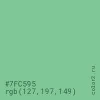 Цвет #7FC595 в цветовой модели RGB обозначается тремя октетами (127, 197, 149) в десятичном формате и #7FC595 в шестнадцатиричном (hex) формате, которые являются интенсивностью красного 127 (hex 7F), интенсивность зелёного 197 (hex C5) и интенсивность синего 149 (hex 95).