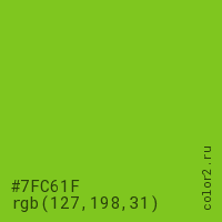 Цвет #7FC61F в цветовой модели RGB обозначается тремя октетами (127, 198, 31) в десятичном формате и #7FC61F в шестнадцатиричном (hex) формате, которые являются интенсивностью красного 127 (hex 7F), интенсивность зелёного 198 (hex C6) и интенсивность синего 31 (hex 1F).