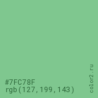 Цвет #7FC78F в цветовой модели RGB обозначается тремя октетами (127, 199, 143) в десятичном формате и #7FC78F в шестнадцатиричном (hex) формате, которые являются интенсивностью красного 127 (hex 7F), интенсивность зелёного 199 (hex C7) и интенсивность синего 143 (hex 8F).