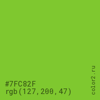 Цвет #7FC82F в цветовой модели RGB обозначается тремя октетами (127, 200, 47) в десятичном формате и #7FC82F в шестнадцатиричном (hex) формате, которые являются интенсивностью красного 127 (hex 7F), интенсивность зелёного 200 (hex C8) и интенсивность синего 47 (hex 2F).