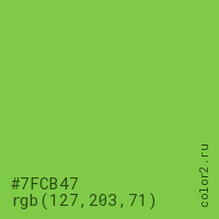 Цвет #7FCB47 в цветовой модели RGB обозначается тремя октетами (127, 203, 71) в десятичном формате и #7FCB47 в шестнадцатиричном (hex) формате, которые являются интенсивностью красного 127 (hex 7F), интенсивность зелёного 203 (hex CB) и интенсивность синего 71 (hex 47).