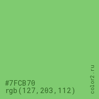 Цвет #7FCB70 в цветовой модели RGB обозначается тремя октетами (127, 203, 112) в десятичном формате и #7FCB70 в шестнадцатиричном (hex) формате, которые являются интенсивностью красного 127 (hex 7F), интенсивность зелёного 203 (hex CB) и интенсивность синего 112 (hex 70).