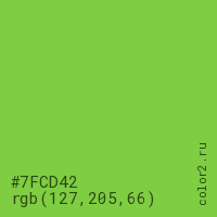 Цвет #7FCD42 в цветовой модели RGB обозначается тремя октетами (127, 205, 66) в десятичном формате и #7FCD42 в шестнадцатиричном (hex) формате, которые являются интенсивностью красного 127 (hex 7F), интенсивность зелёного 205 (hex CD) и интенсивность синего 66 (hex 42).