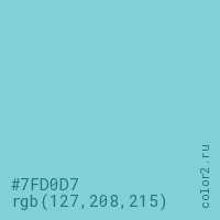 Цвет #7FD0D7 в цветовой модели RGB обозначается тремя октетами (127, 208, 215) в десятичном формате и #7FD0D7 в шестнадцатиричном (hex) формате, которые являются интенсивностью красного 127 (hex 7F), интенсивность зелёного 208 (hex D0) и интенсивность синего 215 (hex D7).