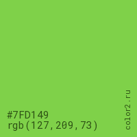 Цвет #7FD149 в цветовой модели RGB обозначается тремя октетами (127, 209, 73) в десятичном формате и #7FD149 в шестнадцатиричном (hex) формате, которые являются интенсивностью красного 127 (hex 7F), интенсивность зелёного 209 (hex D1) и интенсивность синего 73 (hex 49).
