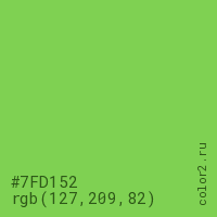 Цвет #7FD152 в цветовой модели RGB обозначается тремя октетами (127, 209, 82) в десятичном формате и #7FD152 в шестнадцатиричном (hex) формате, которые являются интенсивностью красного 127 (hex 7F), интенсивность зелёного 209 (hex D1) и интенсивность синего 82 (hex 52).
