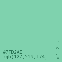 Цвет #7FD2AE в цветовой модели RGB обозначается тремя октетами (127, 210, 174) в десятичном формате и #7FD2AE в шестнадцатиричном (hex) формате, которые являются интенсивностью красного 127 (hex 7F), интенсивность зелёного 210 (hex D2) и интенсивность синего 174 (hex AE).