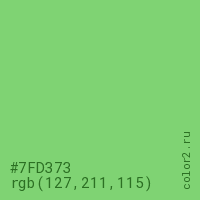 Цвет #7FD373 в цветовой модели RGB обозначается тремя октетами (127, 211, 115) в десятичном формате и #7FD373 в шестнадцатиричном (hex) формате, которые являются интенсивностью красного 127 (hex 7F), интенсивность зелёного 211 (hex D3) и интенсивность синего 115 (hex 73).