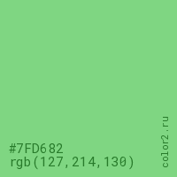 Цвет #7FD682 в цветовой модели RGB обозначается тремя октетами (127, 214, 130) в десятичном формате и #7FD682 в шестнадцатиричном (hex) формате, которые являются интенсивностью красного 127 (hex 7F), интенсивность зелёного 214 (hex D6) и интенсивность синего 130 (hex 82).