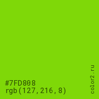 Цвет #7FD808 в цветовой модели RGB обозначается тремя октетами (127, 216, 8) в десятичном формате и #7FD808 в шестнадцатиричном (hex) формате, которые являются интенсивностью красного 127 (hex 7F), интенсивность зелёного 216 (hex D8) и интенсивность синего 8 (hex 08).