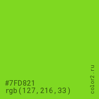 Цвет #7FD821 в цветовой модели RGB обозначается тремя октетами (127, 216, 33) в десятичном формате и #7FD821 в шестнадцатиричном (hex) формате, которые являются интенсивностью красного 127 (hex 7F), интенсивность зелёного 216 (hex D8) и интенсивность синего 33 (hex 21).