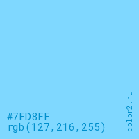 Цвет #7FD8FF в цветовой модели RGB обозначается тремя октетами (127, 216, 255) в десятичном формате и #7FD8FF в шестнадцатиричном (hex) формате, которые являются интенсивностью красного 127 (hex 7F), интенсивность зелёного 216 (hex D8) и интенсивность синего 255 (hex FF).