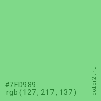 Цвет #7FD989 в цветовой модели RGB обозначается тремя октетами (127, 217, 137) в десятичном формате и #7FD989 в шестнадцатиричном (hex) формате, которые являются интенсивностью красного 127 (hex 7F), интенсивность зелёного 217 (hex D9) и интенсивность синего 137 (hex 89).