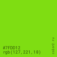 Цвет #7FDD12 в цветовой модели RGB обозначается тремя октетами (127, 221, 18) в десятичном формате и #7FDD12 в шестнадцатиричном (hex) формате, которые являются интенсивностью красного 127 (hex 7F), интенсивность зелёного 221 (hex DD) и интенсивность синего 18 (hex 12).