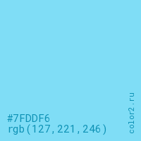 Цвет #7FDDF6 в цветовой модели RGB обозначается тремя октетами (127, 221, 246) в десятичном формате и #7FDDF6 в шестнадцатиричном (hex) формате, которые являются интенсивностью красного 127 (hex 7F), интенсивность зелёного 221 (hex DD) и интенсивность синего 246 (hex F6).