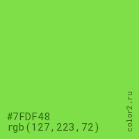 Цвет RGB(127, 223, 72) в процентом отношении количества цвета состоит из 49.8% красного (red), 87.5% зелёного (green) и 28.2% синего (blue).