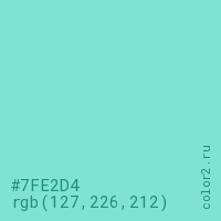 Цвет #7FE2D4 в цветовой модели RGB обозначается тремя октетами (127, 226, 212) в десятичном формате и #7FE2D4 в шестнадцатиричном (hex) формате, которые являются интенсивностью красного 127 (hex 7F), интенсивность зелёного 226 (hex E2) и интенсивность синего 212 (hex D4).