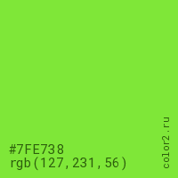 Цвет #7FE738 в цветовой модели RGB обозначается тремя октетами (127, 231, 56) в десятичном формате и #7FE738 в шестнадцатиричном (hex) формате, которые являются интенсивностью красного 127 (hex 7F), интенсивность зелёного 231 (hex E7) и интенсивность синего 56 (hex 38).