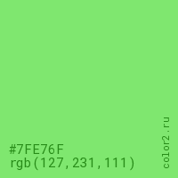 Цвет #7FE76F в цветовой модели RGB обозначается тремя октетами (127, 231, 111) в десятичном формате и #7FE76F в шестнадцатиричном (hex) формате, которые являются интенсивностью красного 127 (hex 7F), интенсивность зелёного 231 (hex E7) и интенсивность синего 111 (hex 6F).
