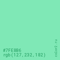 Цвет #7FE8B6 в цветовой модели RGB обозначается тремя октетами (127, 232, 182) в десятичном формате и #7FE8B6 в шестнадцатиричном (hex) формате, которые являются интенсивностью красного 127 (hex 7F), интенсивность зелёного 232 (hex E8) и интенсивность синего 182 (hex B6).