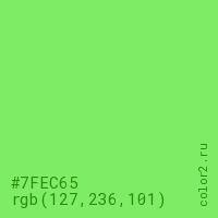 Цвет #7FEC65 в цветовой модели RGB обозначается тремя октетами (127, 236, 101) в десятичном формате и #7FEC65 в шестнадцатиричном (hex) формате, которые являются интенсивностью красного 127 (hex 7F), интенсивность зелёного 236 (hex EC) и интенсивность синего 101 (hex 65).