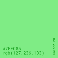 Цвет #7FEC85 в цветовой модели RGB обозначается тремя октетами (127, 236, 133) в десятичном формате и #7FEC85 в шестнадцатиричном (hex) формате, которые являются интенсивностью красного 127 (hex 7F), интенсивность зелёного 236 (hex EC) и интенсивность синего 133 (hex 85).