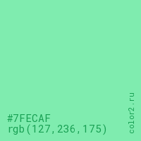 Цвет #7FECAF в цветовой модели RGB обозначается тремя октетами (127, 236, 175) в десятичном формате и #7FECAF в шестнадцатиричном (hex) формате, которые являются интенсивностью красного 127 (hex 7F), интенсивность зелёного 236 (hex EC) и интенсивность синего 175 (hex AF).