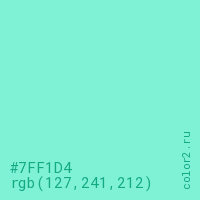 Цвет #7FF1D4 в цветовой модели RGB обозначается тремя октетами (127, 241, 212) в десятичном формате и #7FF1D4 в шестнадцатиричном (hex) формате, которые являются интенсивностью красного 127 (hex 7F), интенсивность зелёного 241 (hex F1) и интенсивность синего 212 (hex D4).