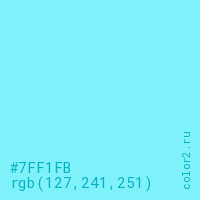 Цвет #7FF1FB в цветовой модели RGB обозначается тремя октетами (127, 241, 251) в десятичном формате и #7FF1FB в шестнадцатиричном (hex) формате, которые являются интенсивностью красного 127 (hex 7F), интенсивность зелёного 241 (hex F1) и интенсивность синего 251 (hex FB).