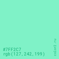 Цвет #7FF2C7 в цветовой модели RGB обозначается тремя октетами (127, 242, 199) в десятичном формате и #7FF2C7 в шестнадцатиричном (hex) формате, которые являются интенсивностью красного 127 (hex 7F), интенсивность зелёного 242 (hex F2) и интенсивность синего 199 (hex C7).